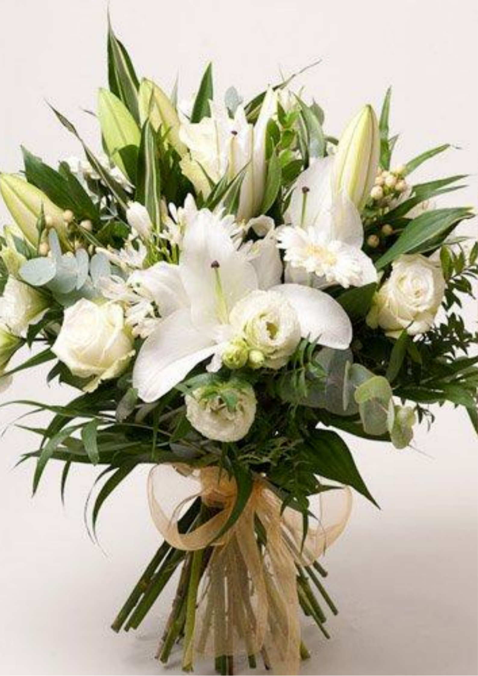 • Bouquet of Pure White/Pastel Flowers (Lilies, daisies & Roses) with green foliage.